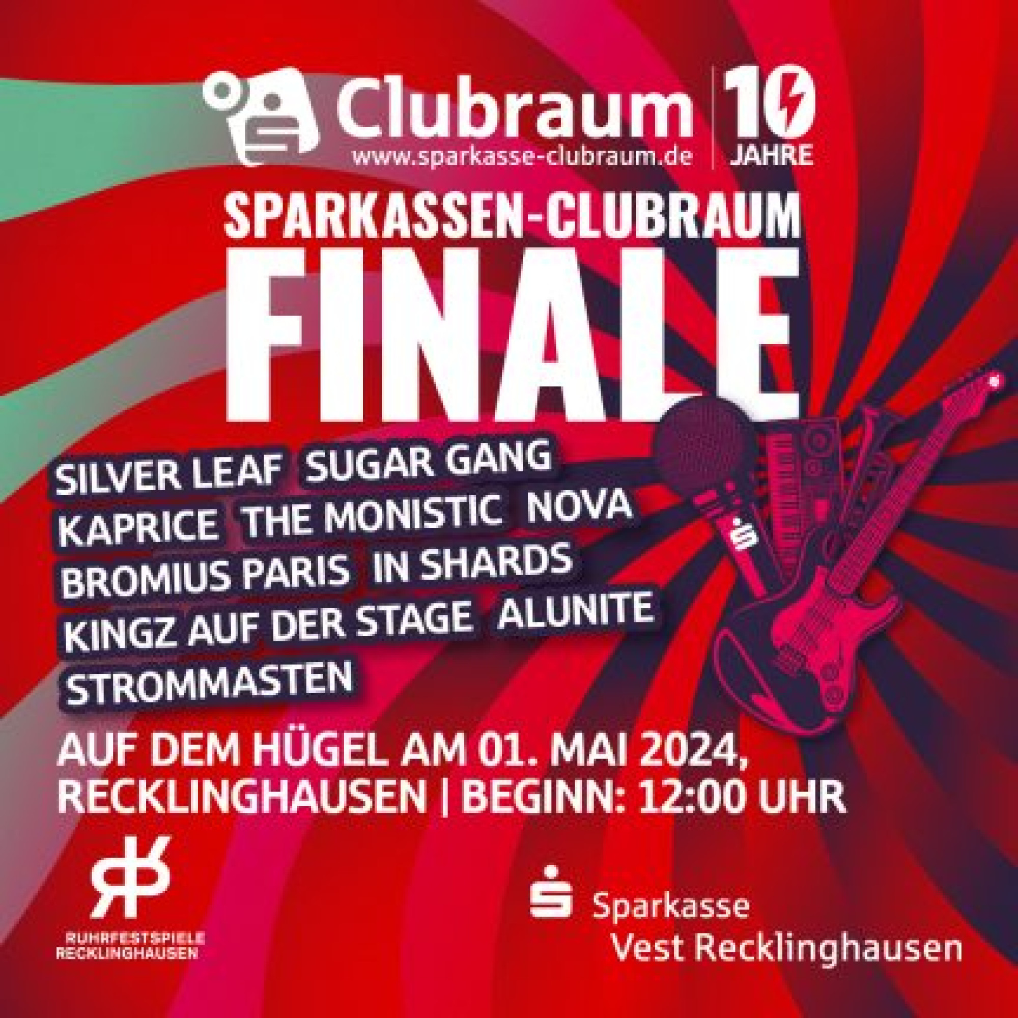 Zur Eröffnung der Ruhrfestspiele treten am 1. Mai zehn Bands beim Sparkassen-Clubraum-Finale auf der großen Bühne im Stadtgarten Recklinghausen auf dem Grünen Hügel an.