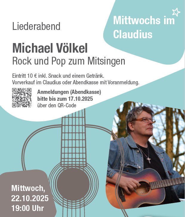 Es gibt eine Alternative (oder besser: Ergänzung) zum Beschallen des Badezimmers: Rudelsingen beim Liederabend im Matthias-Claudius-Zentrum! Egal ob Metallica, Pink Floyd, Genesis, Jethro Tull oder CCR – der Herner Musiker Michael Völkel hat alle Noten drauf und begleitet die Freunde hangemachter Musik mit seiner Akustik-Gitarre und Bass-Stimme. So werden die Lieblingsongs der Mitsänger*innen zu einem Querschnitt durch 50 Jahre Rock- und Pop-Geschichte. Dazu serviert das Claudius-Team kühle Getränke und heiße Snacks.